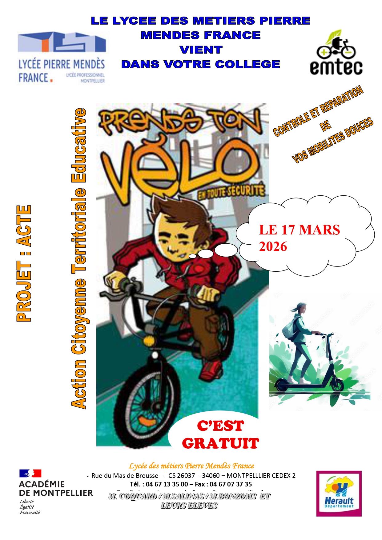 Dans le cadre d’une action citoyenne et d’une opération de sensibilisation à la sécurité routière, les élèves de la section Mobilité Douce EMTEC du Lycée des Métiers Pierre Mendès France interviendront au collège La Petite Camargue pour assurer un contrôle des vélos de nos élèves.
