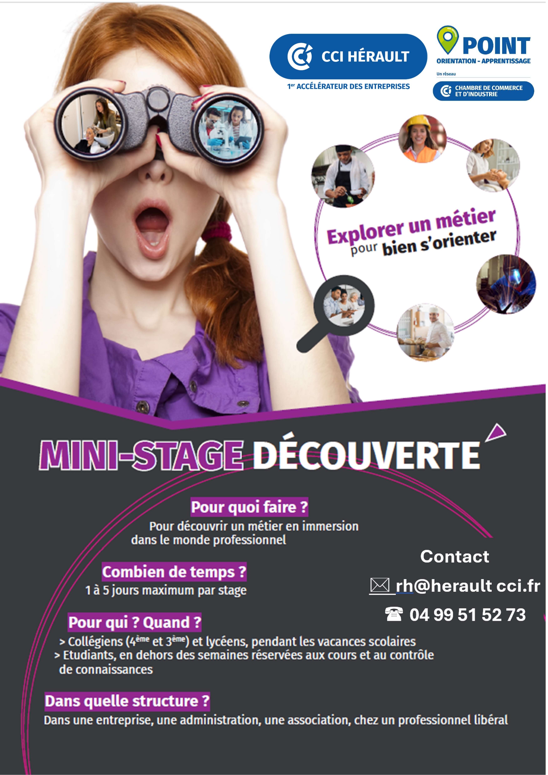 Le mini-stage, c’est l’occasion de se familiariser avec l’entreprise et le monde du travail, découvrir et vivre les professions et les activités qu’elles recouvrent, se faire connaître d’un employeur pour éventuellement signer un contrat en alternance par la suite, choisir sa filière et concrétiser son projet professionnel.