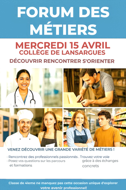 Nous organisons un forum des métiers à l'attention des élèves de 4ème du collège de Lansargues le mercredi 15 avril prochain, en matinée (09h00-12h00).