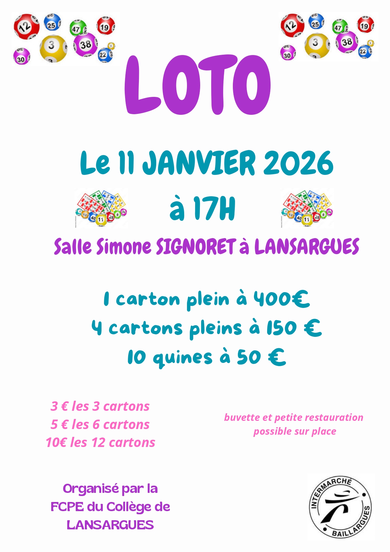 La FCPE organise un loto le dimanche 11 janvier à 17h dans la salle Simone Signoret. Venez nombreux!